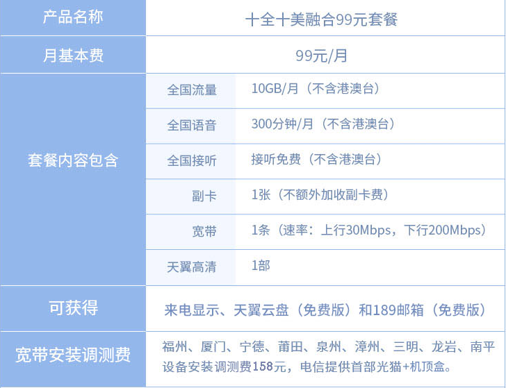99元畅享卡:99=国内流量20G+700分钟全国通话,送300兆宽带